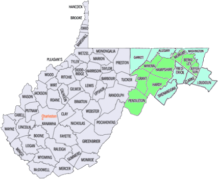 Jefferson County: This small but heavily populated county, part of the Shenandoah Valley, borders the DC suburbs of Northern Virginia and Maryland. Charles Town, the county seat, Shepherdstown, and Harpers Ferry (site of John Brown’s raid and a stop on Amtrak’s Capitol Ltd) are full of Civil War era buildings and a few plantations dating back to slavery. The Charles Town racetrack is a major employer, and the Harpers Ferry National Park and Appalachian Trail attract tourists. Suburban development constantly threatens to overrun the county’s historic towns and countryside.